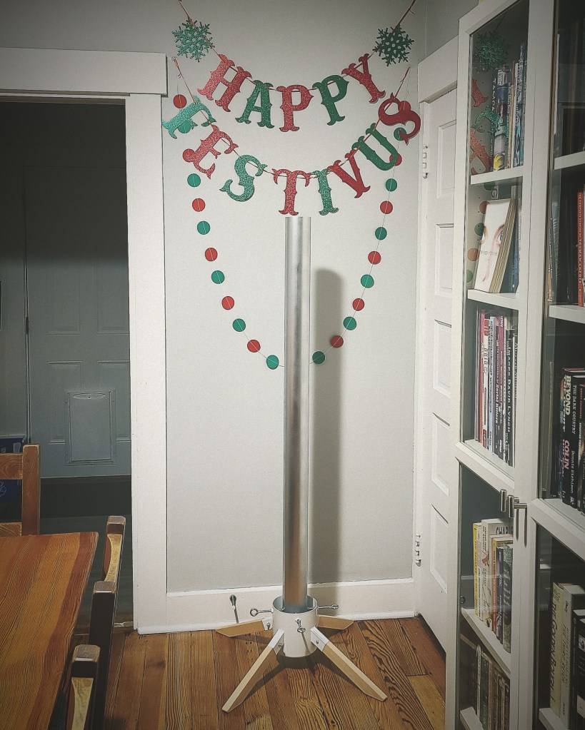 We don’t really celebrate Christmas. I’m atheist and don’t celebrate any Christian holidays. Also, my mom was the biggest Christmas fan and would decorate the house from top to bottom and inside and out. I don’t think any of us kids like to do anything much for it because it reminds us of our mom too much, whose been gone for over a decade now. But my family still does the gift exchange, just the gifts are usually gag gifts, lottery tickets, or gift cards. But in the spirt of the gag gifts I did put up a Festivus pole. For those who don’t know what that is Google ‘Seinfeld Festivus episode’. Festivus for the rest of us! Here is a photo of my dumb joke.