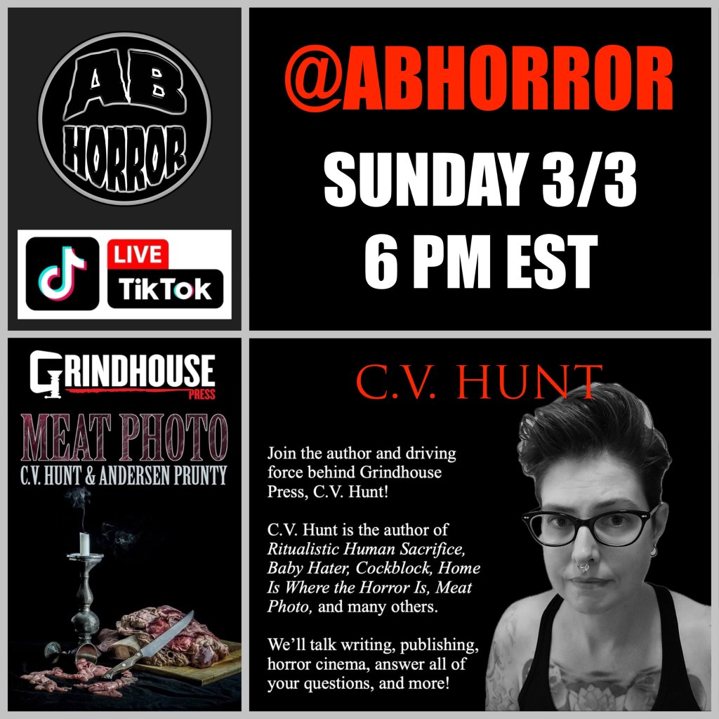 It’s C.V. Hunt, owner of Grindhouse Press. I’ll be doing a live interview on TikTok this Sunday at 6PM EST. Follow @ abhorror on TikTok to join in and ask questions. Plus there’s a giveaway. Watch to see how you can win.